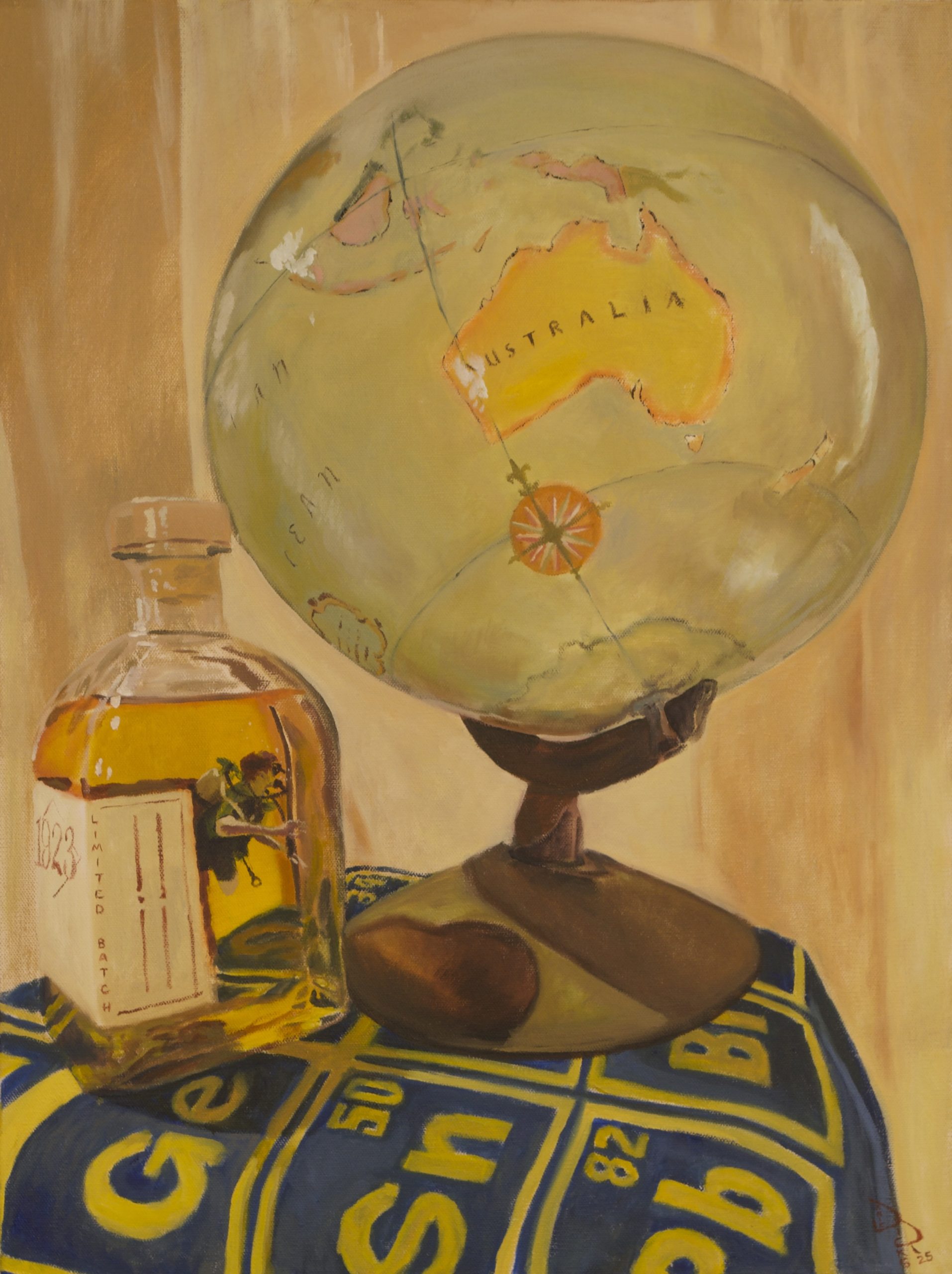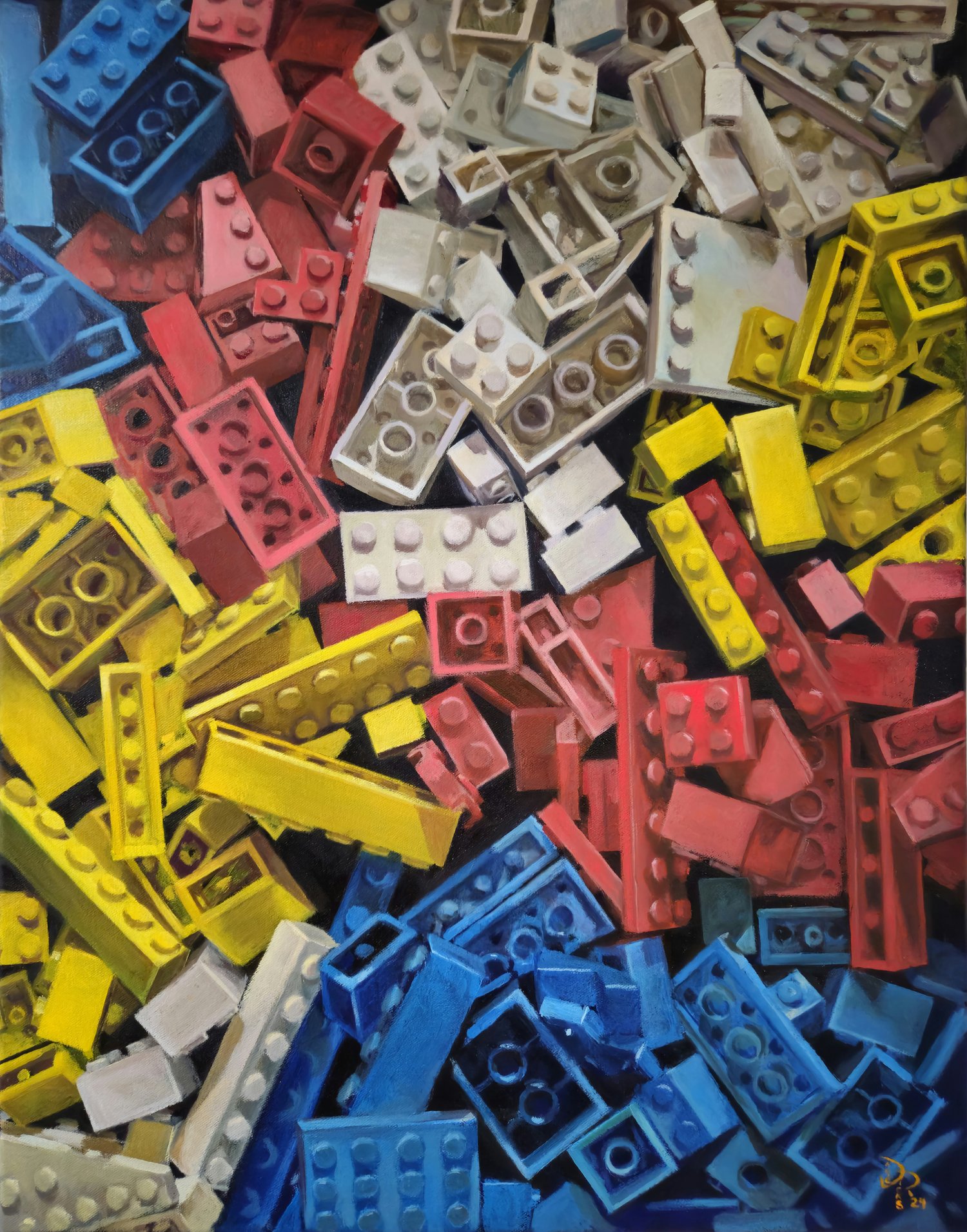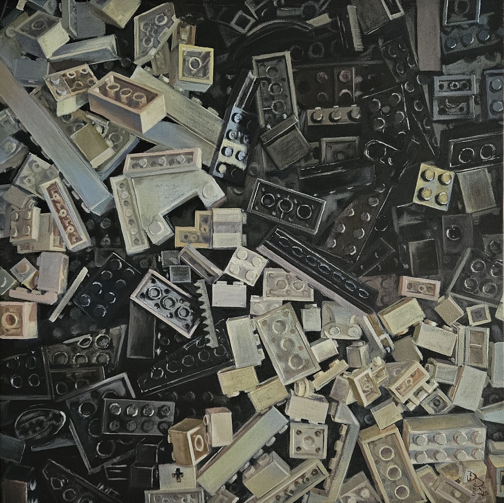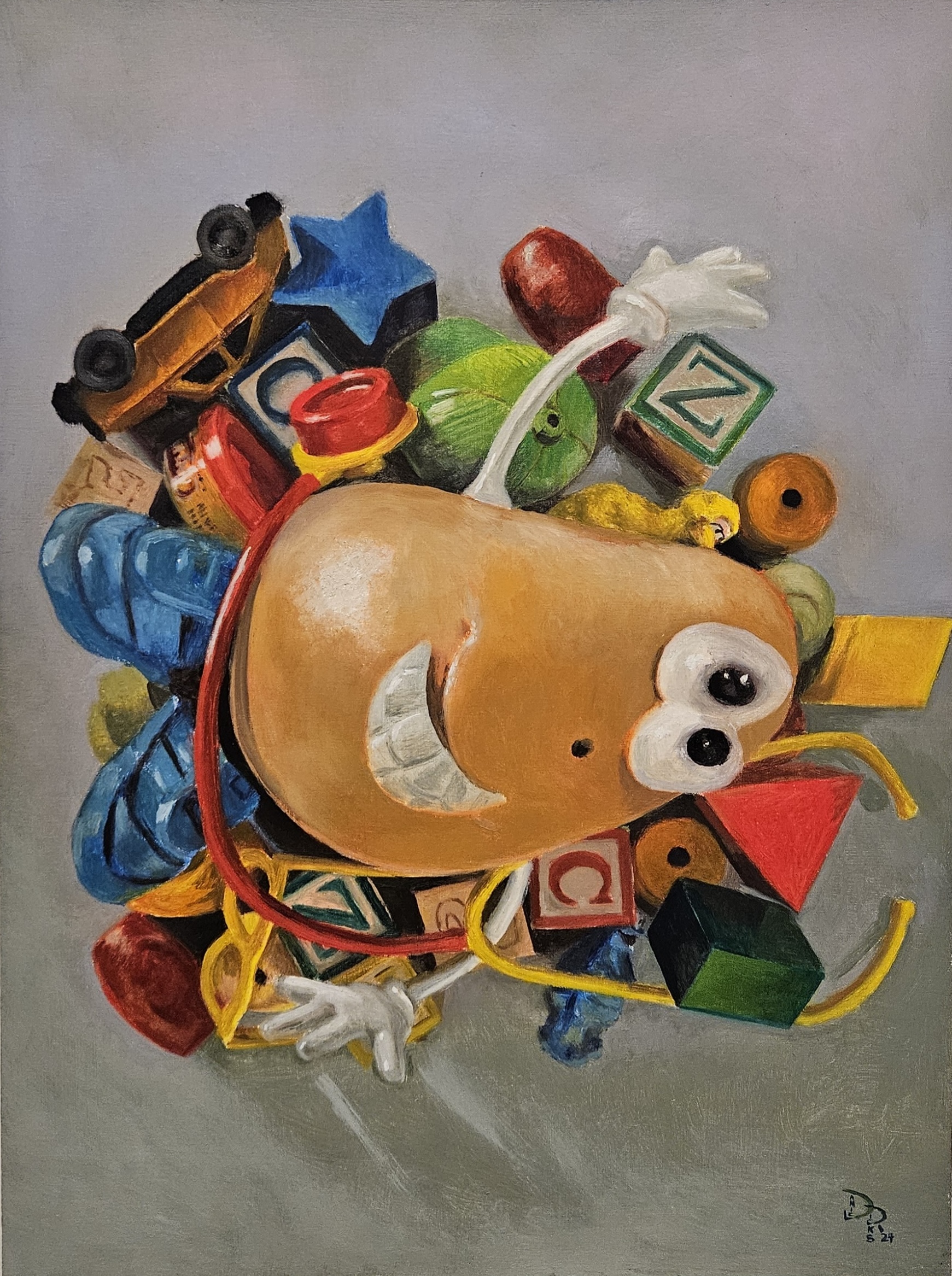In my modern still lifes, I find whimsy in the everyday. I arrange familiar objects in unexpected ways, using light, color, and composition to reveal the stories and emotions hidden in the ordinary. Whether they be a vibrant exploration of the commercialization of childhood or a meticulously painted bad dad joke, these works are representations on presence, nostalgia, and the subtle drama of daily life.